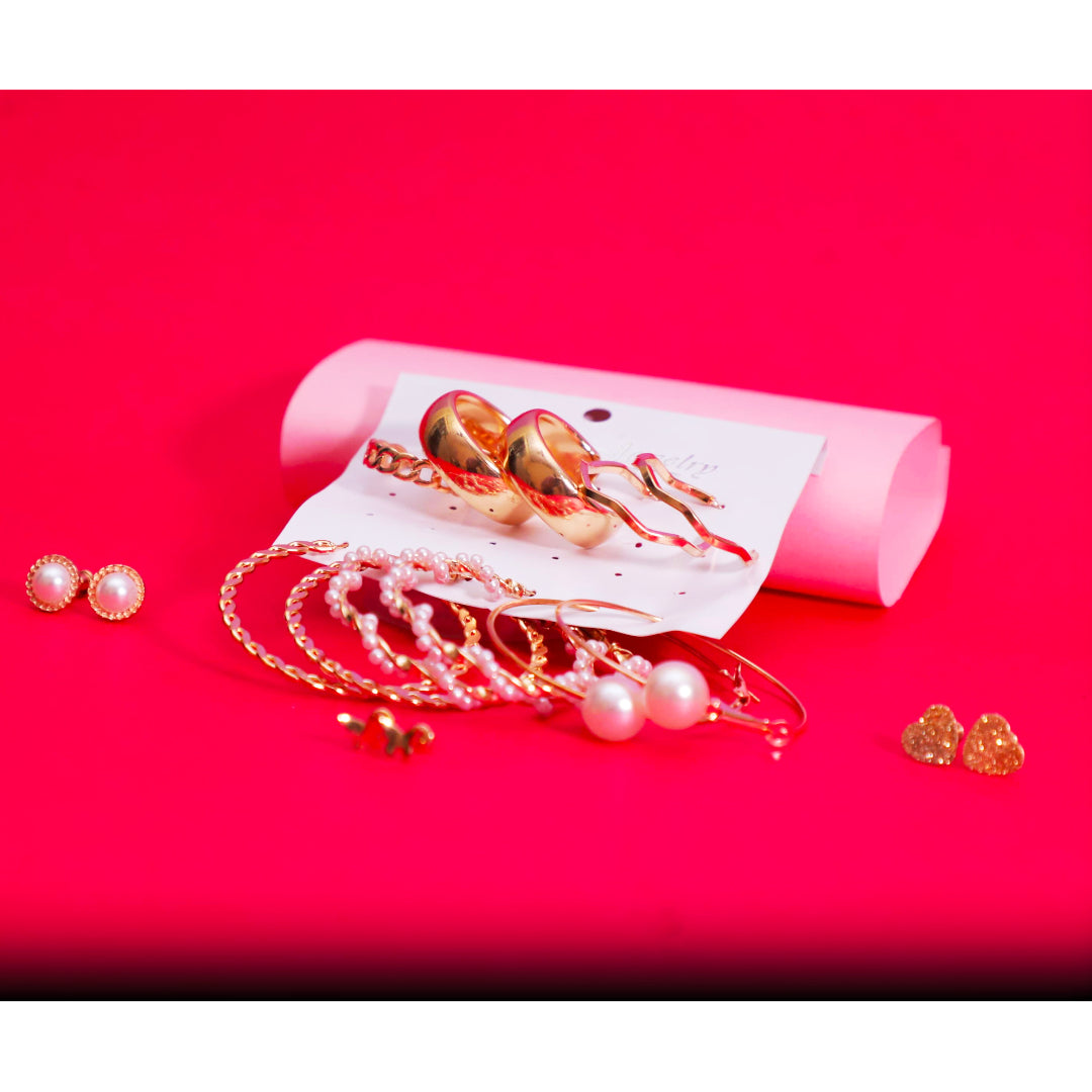 The Rusty Golden Glam Hoop & Stud Earring Set is your go-to accessory collection for every occasion. This 8-pair set features a stunning combination of gold-tone hoops and elegant studs, including pearl-accented designs, twisted textures, and bold chunky styles. Whether you're going for a classy day look or a glamorous evening vibe, this set has something for every mood. All pieces are lightweight, rust-free, and skin-friendly—crafted to add long-lasting charm and comfort to your everyday style.