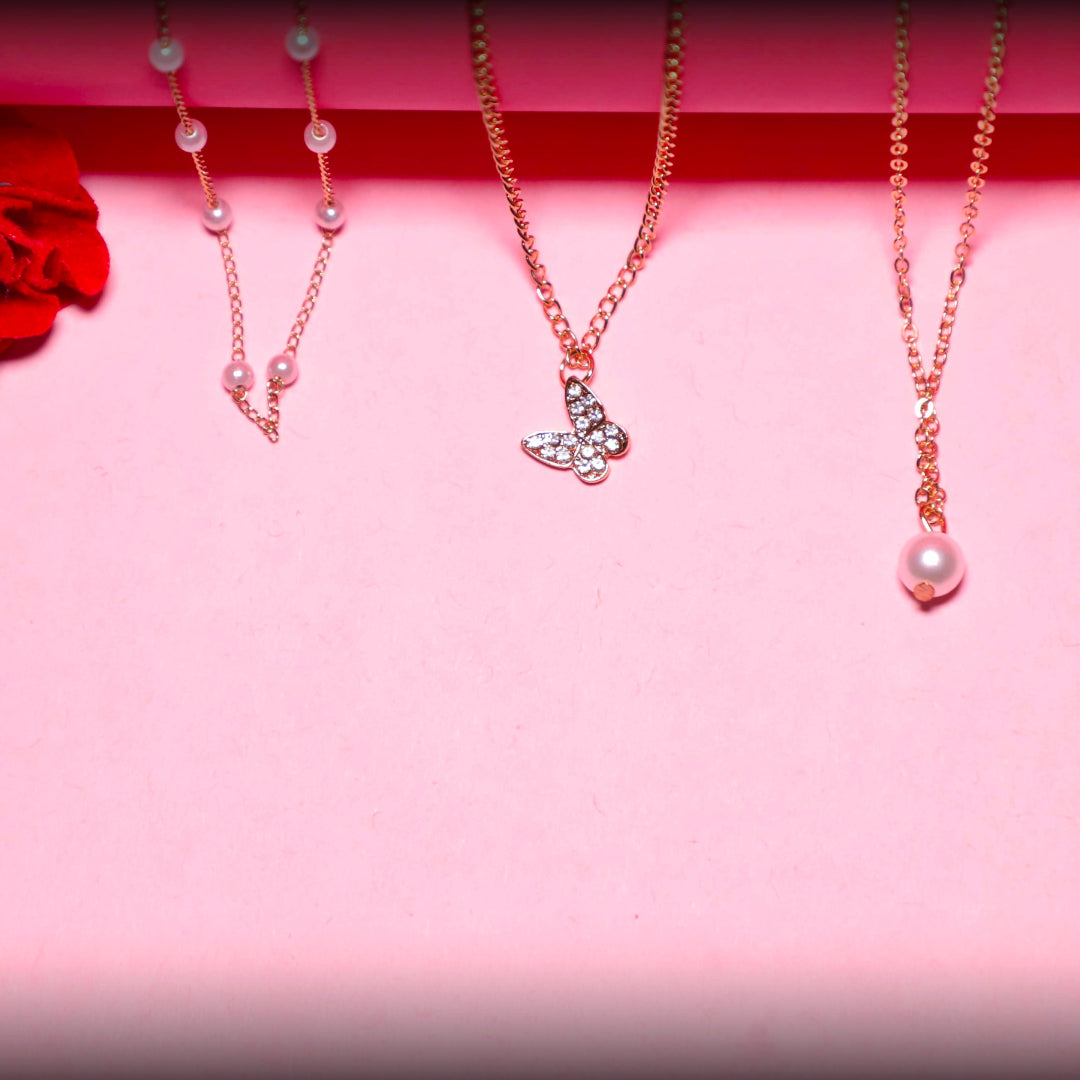 Elevate your everyday look with the Rusty Layered Pearl & Butterfly Necklace Set. This elegant 3-layer gold chain features: